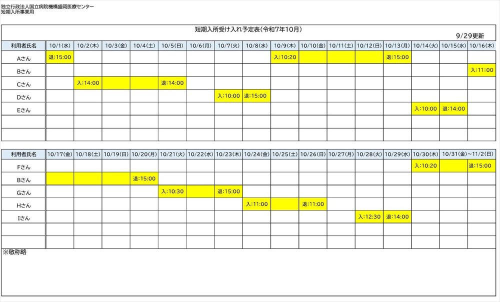 令和7年10月短期入所受け入れの日程をお知らせします。