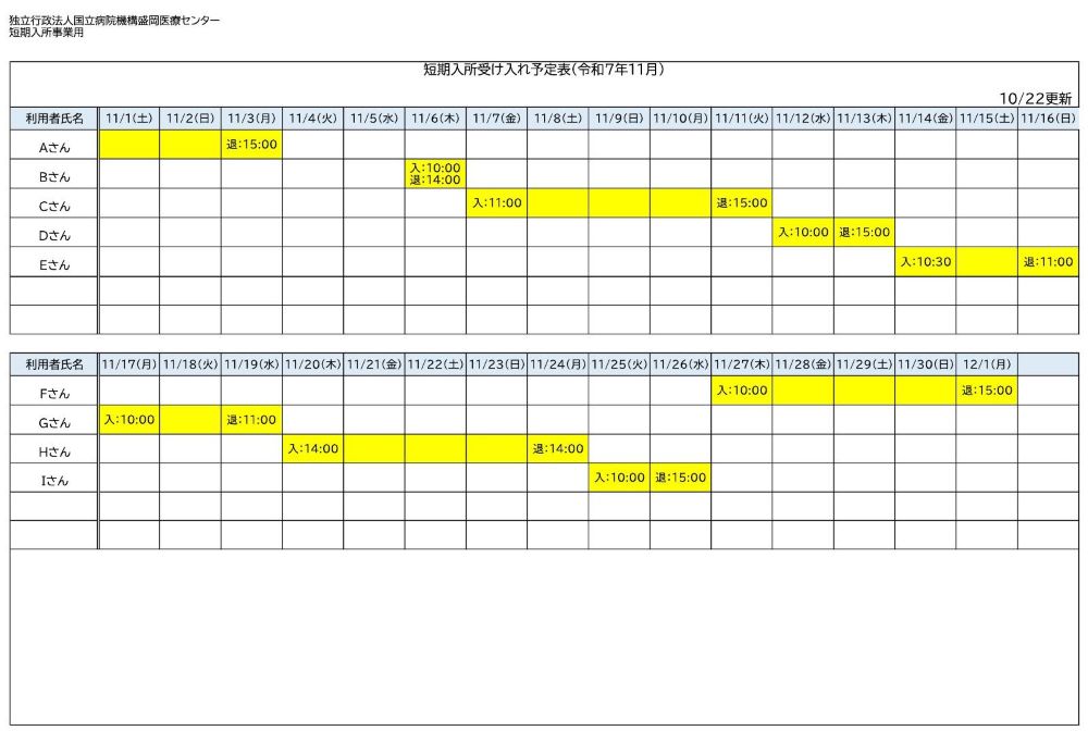 令和7年11月短期入所受け入れの日程をお知らせします。