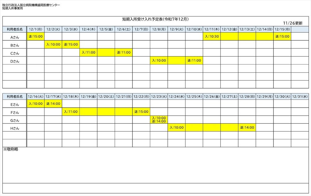 令和7年12月短期入所受け入れの日程をお知らせします。