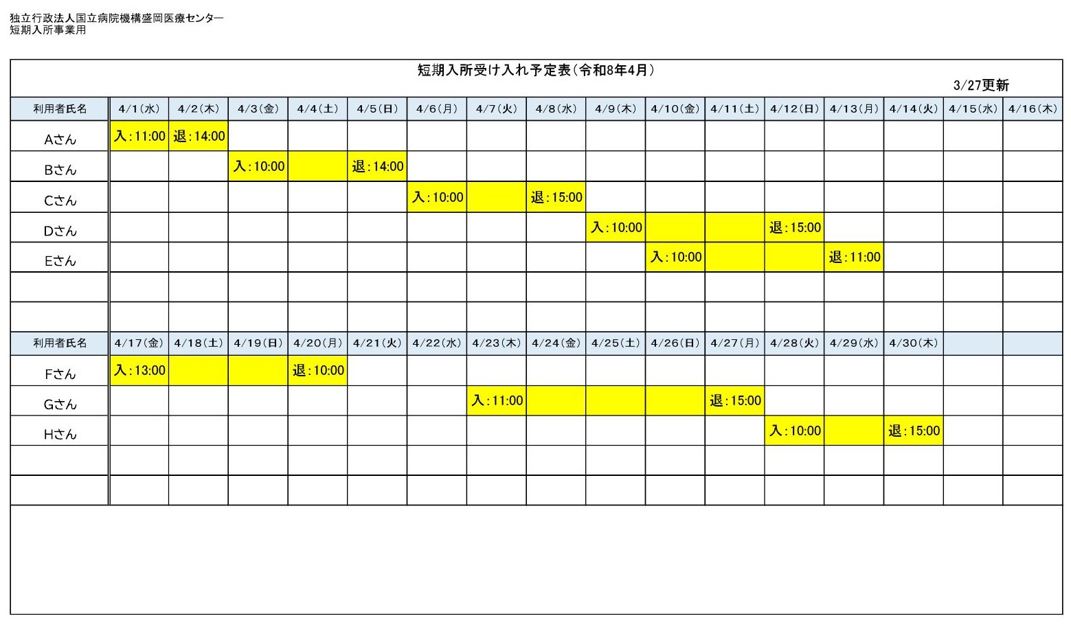 令和8年4月短期入所受け入れの日程をお知らせします。